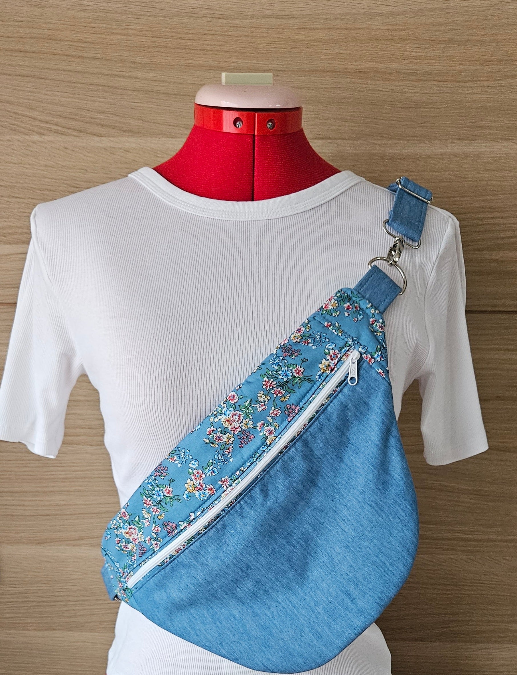 Réalisé en tissu coton effet Jean clair et un tissu liberty pour le dessus et l'intérieur de la banane. Sangle réalisé entièrement à la main en tissu effet Jean clair. Fermeture éclair blanche.